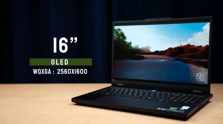 The biggest change isthe displacementl. It has a 16-inch OLED display,y and as it is OLED, you get a glossy display.y, You get light in the room and a black screen in the game. But OLED has its own taste, like the colour gamut is good, here we have 100% RGB, 100% P3, and brightness is up to 500 nits.